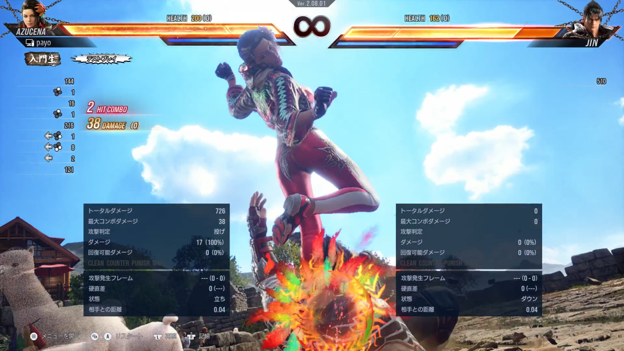 ヒットフレームの6F前~1F後まで受け付けています。成功すると打撃投げに移行します。